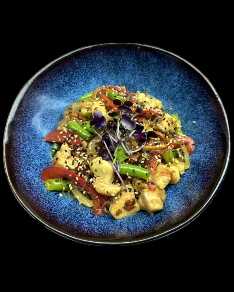 (Локшина фунчоза (бобова), філе стегна, креветки, морква, цибуля ріпчата, перець болгарський, стручкова квасоля, устричний соус, унагі соус, часник, імбир, кунжут)350г