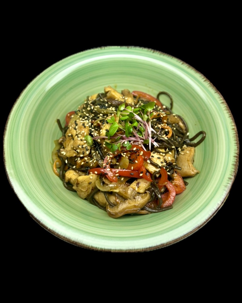 (Локшина соба, філе стегна, морква, цибуля ріпчата, перець болгарський, гриби шиїтаке, соус вок. унагі соус, чаник, імбир, кунжут) 360г